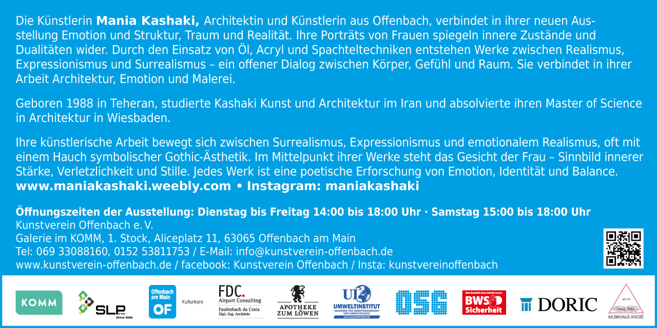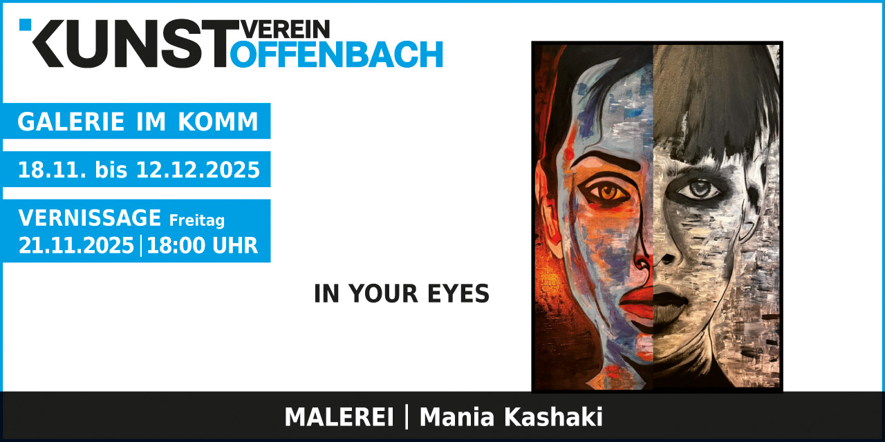 Die Künstlerin Mania Kashaki, Architektin und Künstlerin aus Offenbach, verbindet in ihrer neuen Ausstellung „IN YOUR EYES“ Emotion und Struktur, Traum und Realität. Ihre Porträts von Frauen spiegeln innere Zustände und Dualitäten wider. Durch den Einsatz von Öl, Acryl und Spachteltechniken entstehen Werke zwischen Realismus, Expressionismus und Surrealismus – ein offener Dialog zwischen Körper, Gefühl und Raum. Sie verbindet in ihrer Arbeit Architektur, Emotion und Malerei.